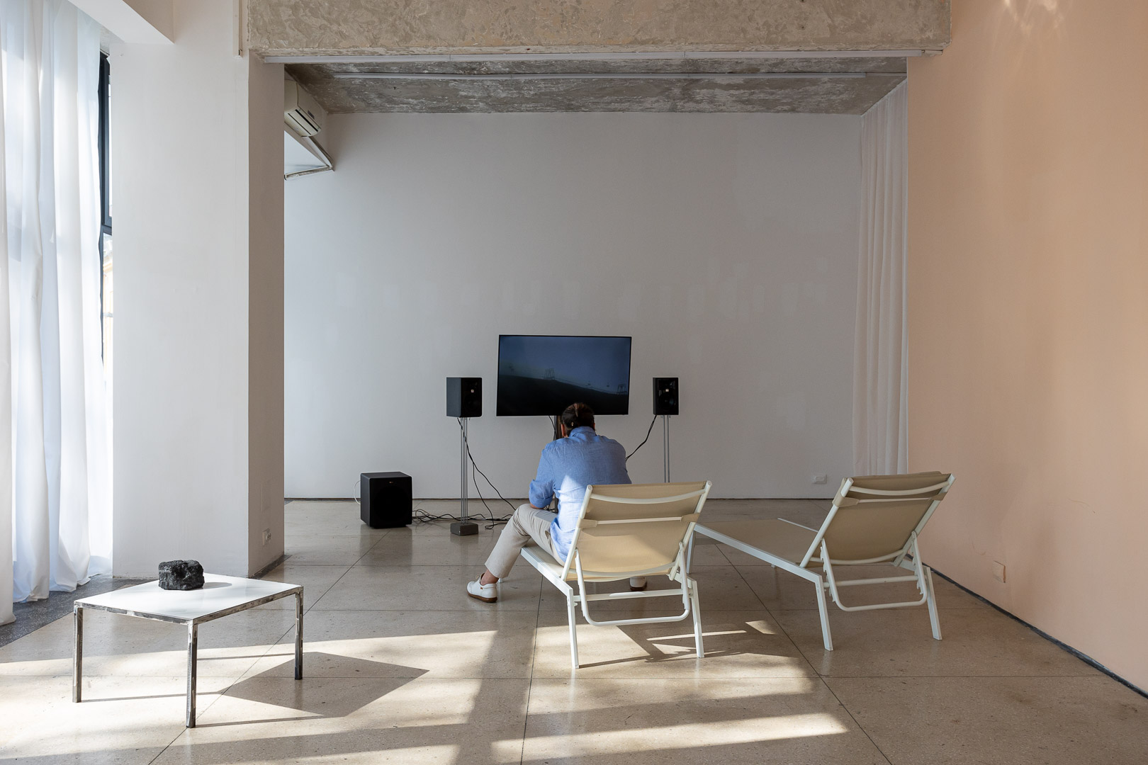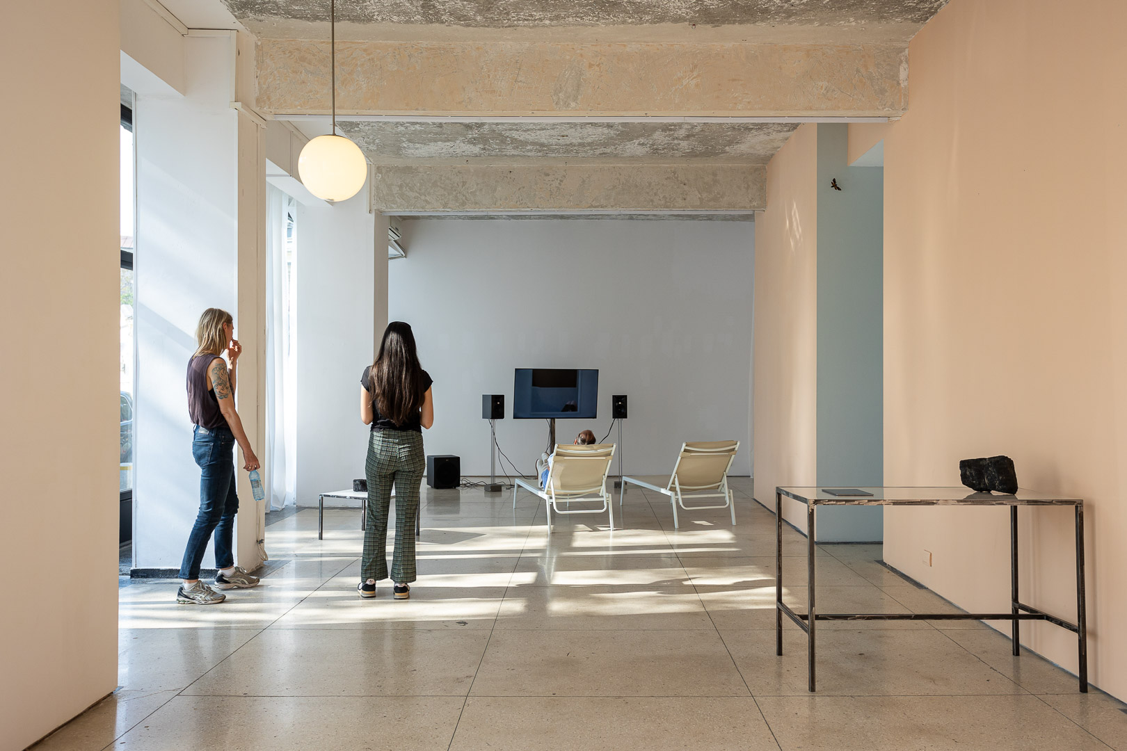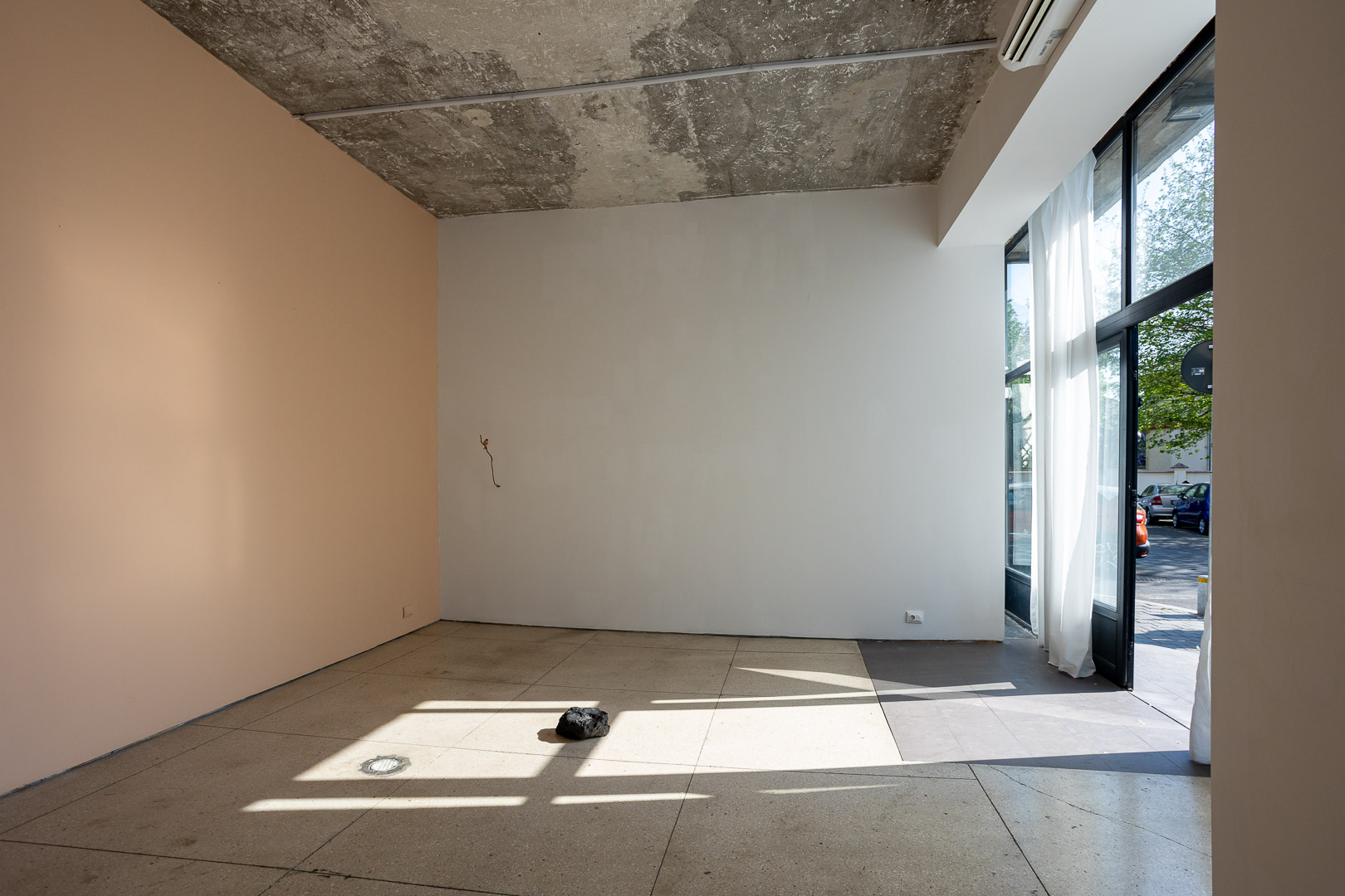 Apropo de jocul dintre ceea ce controlezi si ceea ce lasi sa fie, de la caderea peretelui incoace, galeria este inundata constant de lumina naturala, uneori foarte puternica, alteori ritmata. Din acest motiv, spatiul e departe de a fi un white cube clasic, ermetic, luminat in mod controlat. Ca urmare, aici nu sunt expuse foarte des lucrari video, ci mai degraba instalatii si sculpturi. Dar, adauga Cristina, spatiul principal al galeriei ramane un white cube, doar ca unul care se schimba cu fiecare expozitie. Iar lumina nu presupune doar constrangeri, ci si aparitia unor momente magice — apusul e unul dintre ele.